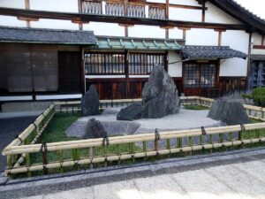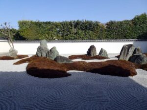 江戸時代に創建された寺院。本堂前に重森三玲作庭の枯山水の「心和の庭」、庫裏前に同じく「心月庭」が広がります。「出水の七不思議」の一つという江戸時代の絵馬「浮かれ猫図」を拝観しました。書置きの御朱印をいただきました。